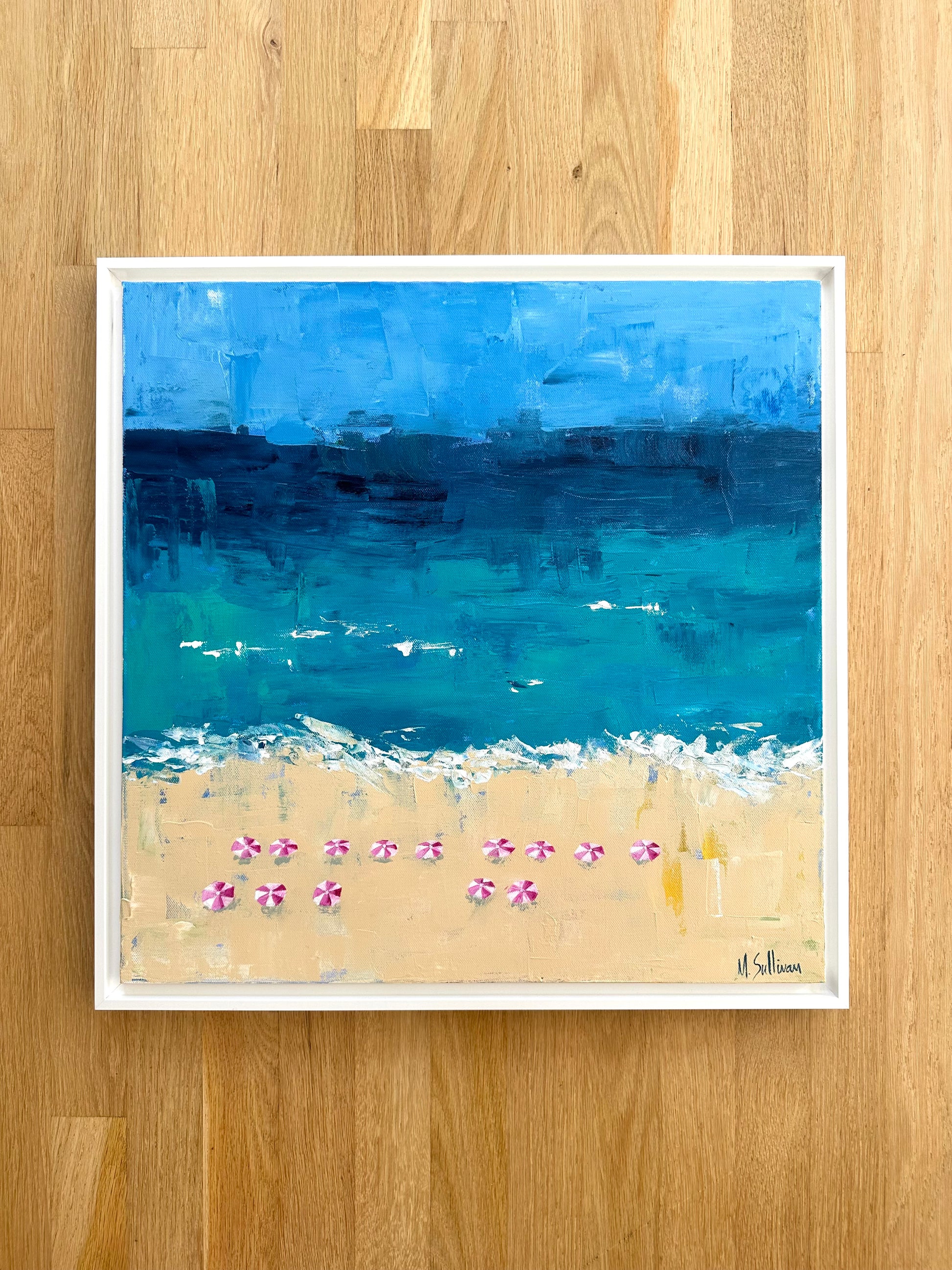 Bold blues, soft sand, and a perfect row of pink umbrellas. Bermuda Blues brings order to the shoreline with a palette that feels both bright and breezy. An aerial moment where color and composition do all the talking.