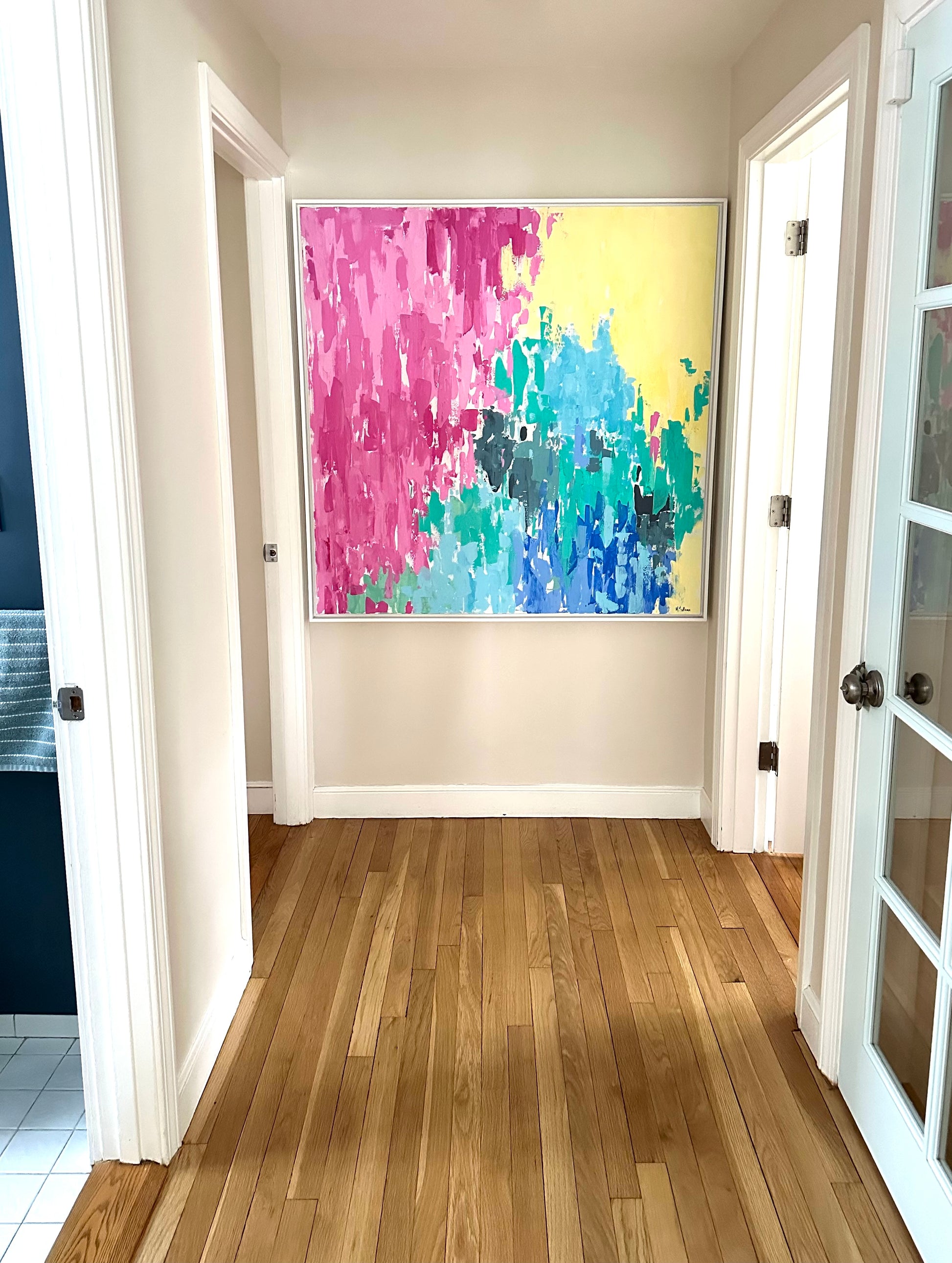A celebration of bold color and expressive brushwork, Color Crush is pure energy on canvas. Layers of pink, teal, cobalt, and citron collide in a composition that feels spontaneous yet intentional. This piece brings major movement, joy, and a little bit of attitude.